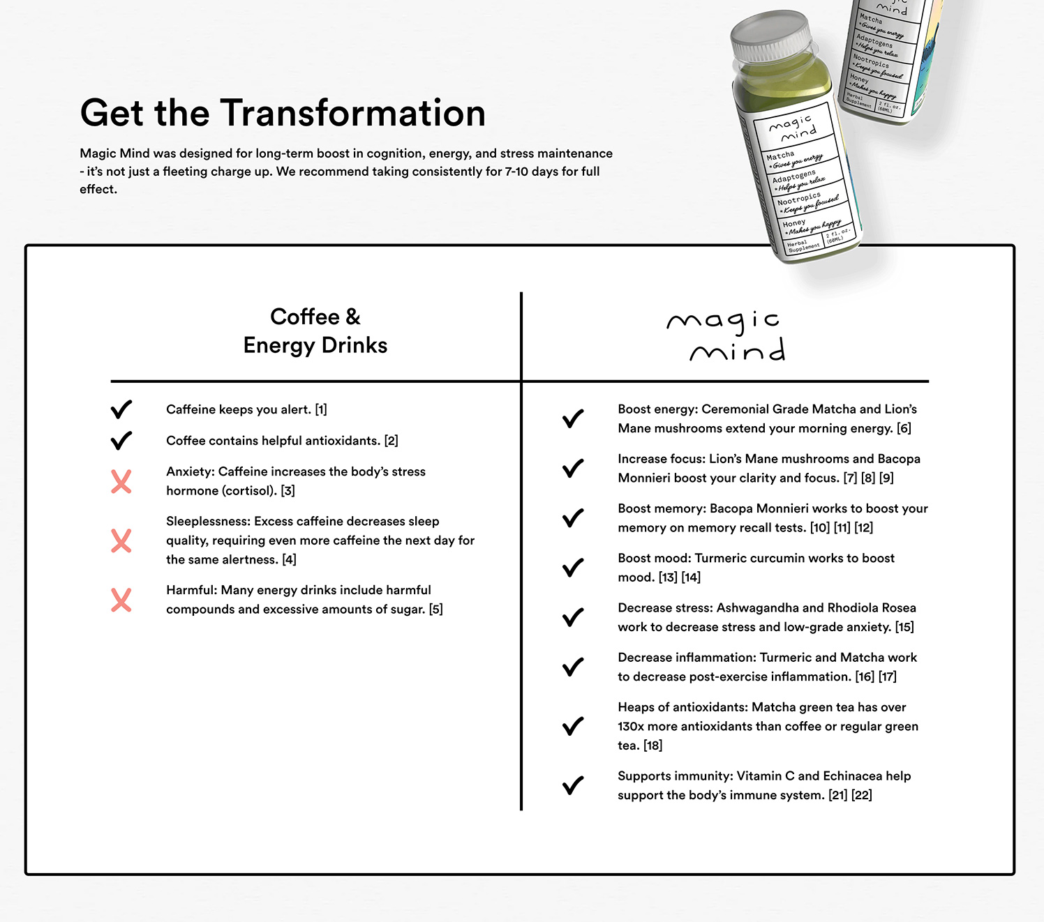 - Subtitle (explains how you'll create it): Instead of a traditional sub-headline to introduce the product, Magic Mind uses a brilliant testimony that checks the box.